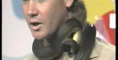 عالم الحيوان الأسترالي ستيف إيروين في عرض تلفزيوني مباشر في عام 1991 يتعرض للعض على رقبته من قبل ثعبان, ولكنها لا تزال تتألف تماما.