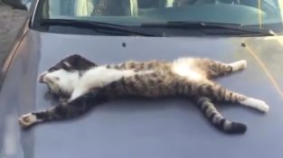 قط هو الكذب على ظهرها على غطاء محرك السيارة من سيارة, تتمتع نوم الاسترخاء.