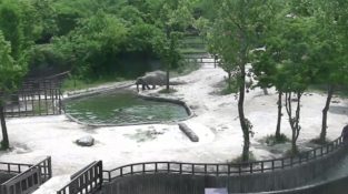 في حديقة اللعبة في جنوب. كوريا, زوج من الفيلة هرعت الى مساعدة خسائرها صغيرة في مياه بحيرة صغيرة.
