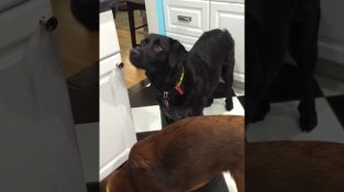 اثنين من الكلاب في محاولة لأكل الجزر التي تطير من قبل صاحبها،. يبدو واحدة لا تتمتع مذاقها, والأخير يستفيد من الوضع..