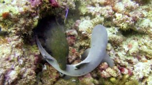 A موراي مهاجمة yfalokarcharia lefkopterygo ويحاول ابتلاع. القرش يقاوم...