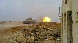 وبعد تبادل لاطلاق النار المتمردين, يتجنب دبابة T-72 الجيش السوري صاروخ مضاد للدبابات تتراجع إلى الخلف بسرعة.