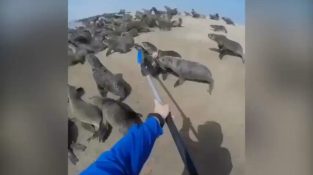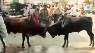 وهناك رجل في الهند محاولة لتقسيم ثورين مشاجرة على الطريق. لكن واحدة من الثيران سوف يعطيه درسا جيدا.