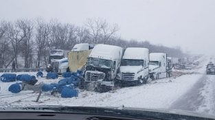 على الطريق السريع I-70 قرب مدينة كانساس سيتي بولاية ميسوري, سجل سائق شاحنة مثير للإعجاب تتراكم 40 سيارة.