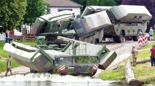 في Großenwieden ألمانيا, يستخدم الجيش مركبة برمائية M3 لإنشاء جسر / العبارة. الجسر يستخدم لمساعدة راكبي الدراجات مهرجان الدراجات لعبور نهر فيزر.