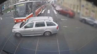 وتقع سيارة بين اثنين من الترام في التشيك برنو.