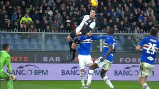 كريستيانو رونالدو يجعل قفزة المحتمل وويحقق على درجة ممتازة من ضربة رأس في المباراة الأخيرة من يوفنتوس ضد سامبدوريا.