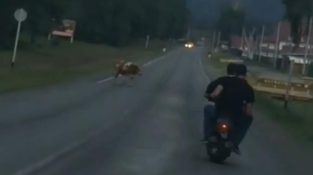 في روسيا, شابان مخموران على دراجة بخارية لا تكاد تتحمل وزنهما, تصطدم ببقرة تعبر الطريق بدون ضغط.