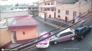 طريق زلق على منحدر شديد الانحدار في أوبريغون ، المكسيك. ينتهي الأمر بالعديد من المركبات والدراجات النارية إلى الاصطدام في الكتل المحيطة.