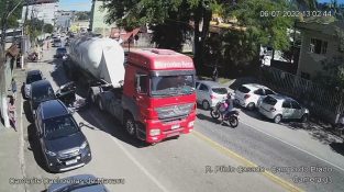 في أحد شوارع البرازيل, امرأة تفتح بابها بينما يقود دراجة نارية بين سيارتها وشاحنة. ينتهي الأمر بسائق الدراجة النارية تحت الشاحنة, لكن دون أن يصاب بجروح خطيرة.