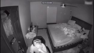 أثناء لعب لعبة فيديو على جهاز الكمبيوتر الخاص به, الأب لديه ردود أفعال للقبض على طفله عندما يراه يسقط من السرير.