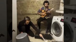 استخدام آلة الايقاع في الغسالة وحوض الملابس, يقوم موسيقيان من فرقة Klangphonics بإنشاء لحن تقني.
