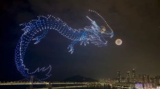 في مدينة بوسان بكوريا الجنوبية, تتزامن مئات الطائرات بدون طيار لإنشاء صورة تنين يأكل كوكبًا.