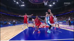 جوران دراجيتش يعيد الكرة بذكاء من فوق أحد لاعبي بولندا, للقبض عليها مرة أخرى وتسجيل نقطة سهلة. لقطة من EuroBasket 2022.