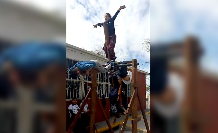 В училище в Мексико Чихуахуа, Четири деца, играещи в странна люлка като вятърна мелница. Деца с внимателен и синхронизирани движения успяват да се върти тази дървена кошара просто разклащане тялото си. Тази люлка е част от традиционна мексиканска танц, наречен Danza де Huahuas, в щата Пуебла.