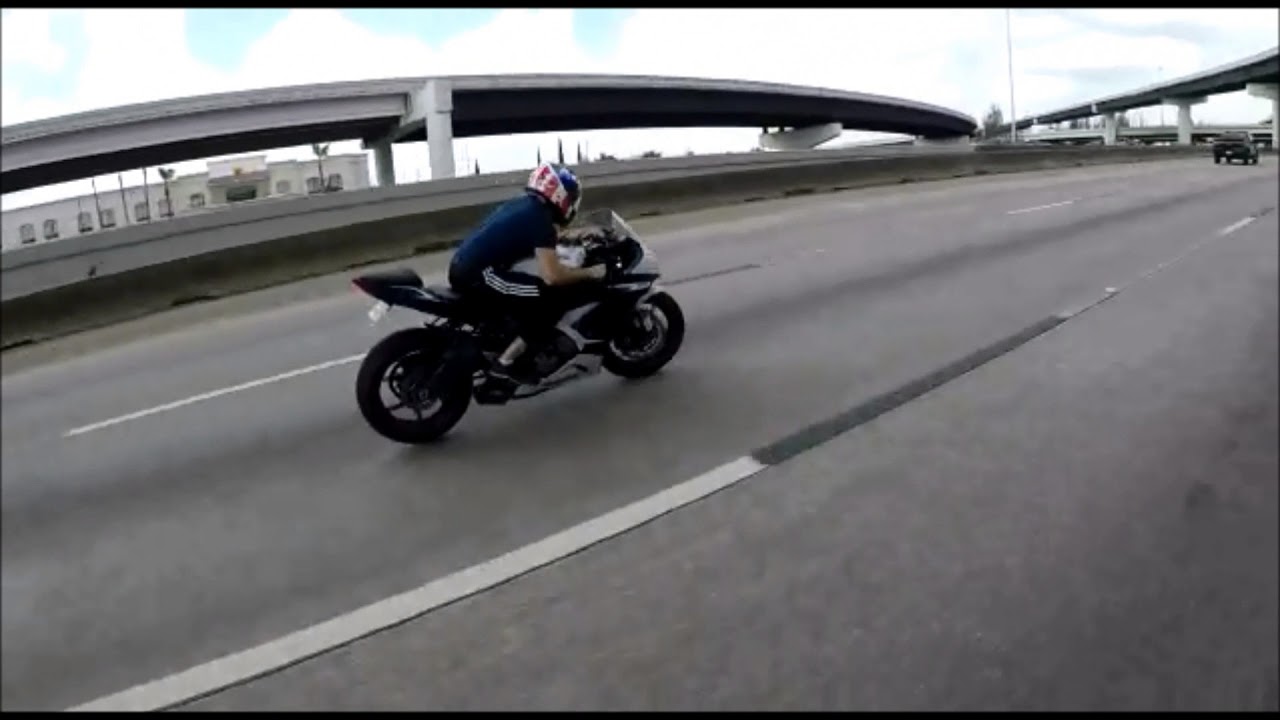 А ездач в Kawasaki Ninja ZX6R движи с 200 km / h и колелото попада в малка локва. Мъжът успява да се възстанови драстично контрол на машината, без да попадат.