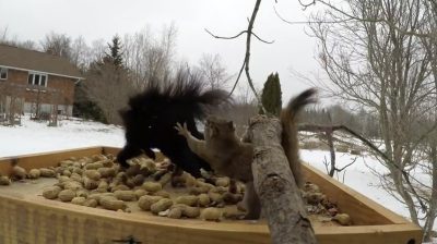 На червено и черно катеричките не се разбираме много добре заедно. постоянно се конкурират за храна и територия и гонеха при всяка възможност. Ето една черна и червена катерица кавга на фидер с фъстъци.