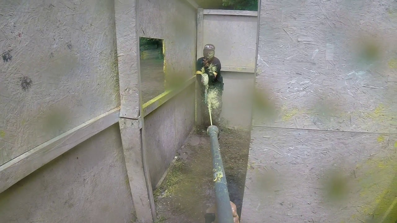 В бойно поле за пейнтбол в Орегон-членки на Организацията на обединените, мъж тества импровизирано оръжие, което работи като 'огнехвъргачка'.