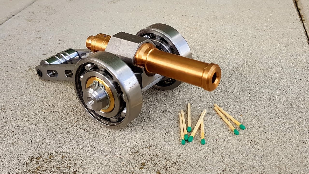 Доказването на мини оръдие построен от механик. Оръдието работи с барут, издигайки малки метални топчета.