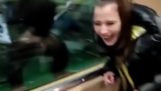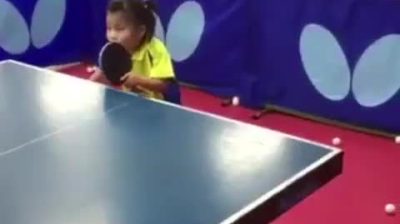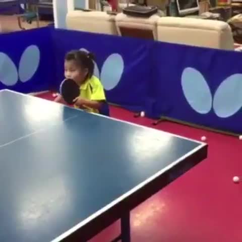 малко момиче играе тенис на маса като професионалист