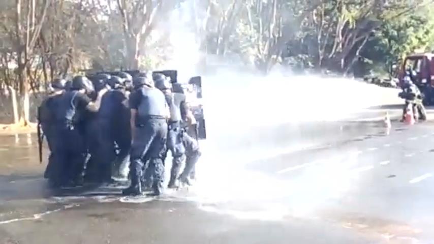 звена на полицията за борба с безредиците в Бразилия, Те обучават в работната група, с помощта на пожарогасене. Пожарникарите хвърляне маркуч вода в полицията, които се опитват да отблъсне щитовете си и да вървим напред. високо налягане на водата ще доведе до някои проблеми за пожарникарите.