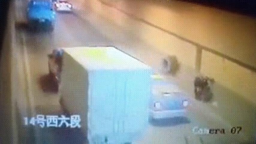 Един човек, шофиране на скутер в тунел в Китай ще се удари два пъти в един ред с колело, което остави един камион. В бездомно колело удари със сила на скутер за първи път и продължава да тече в тунела преди да се върне, за да се удари в нещастен човек за втори път, след като прекара между други превозни средства.