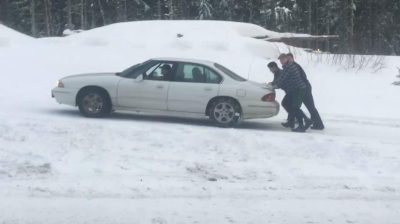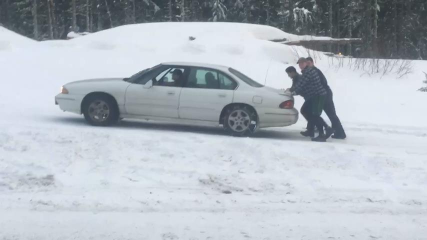 Група от четирима млади бутане кола на снежната път, и те имат сложи вериги за сняг върху задните колела на emprosthiokinitou на колата.