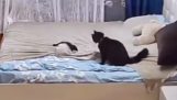 Една жена намира мъжа и котката си в леглото да се отпускат, прави грижа за лицето.