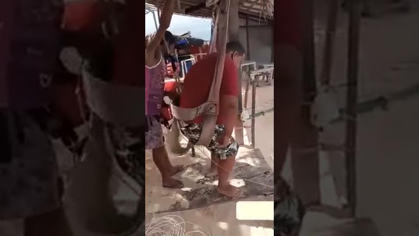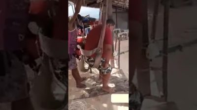 Мъж се опитва да използва въздушна ролка, но системата има трудности да издържи теглото си.