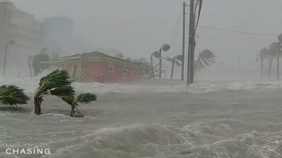 Торент с дълбочина 4,5 метра влачи и унищожава всичко по пътя си в град Форт. Майерс Бийч, Флорида, по време на голямата буря Ян.