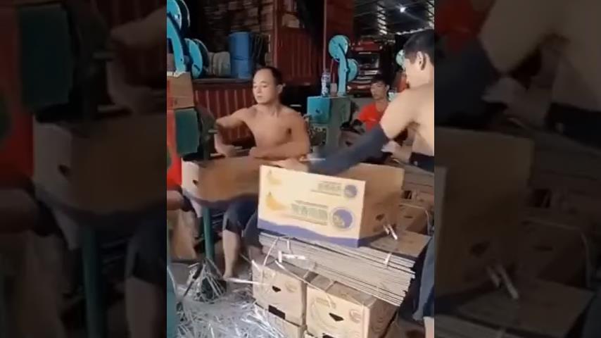 Впечатляващата скорост, с която работниците в бананова компания подготвят и подреждат транспортни кутии.