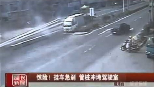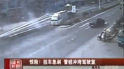 В Китай, камион, превозващ големи бетонови тръби спирачки изведнъж. Тръбите са оставяйки с голяма скорост напред и изкоренят кабината на водача, но тъй като чудо е пострадал.