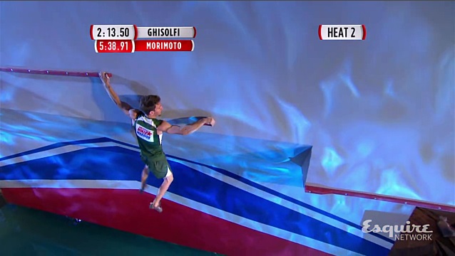 Световна класа италиански алпинист Стефано Ghisolfi завършва впечатляваща най-трудните препятствия далеч Арена, телевизионния конкурс American Ninja Warrior 2014.
