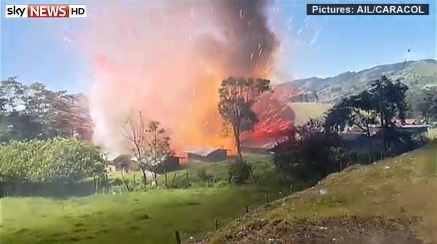 Близо до Гранада, Колумбия, оператор на местен вестник улавя фойерверки фабрика огън, Когато една голяма експлозия, която го прави губи равновесие. Взривът е настъпила неделя, 4 януари 2015 в 10 часа.