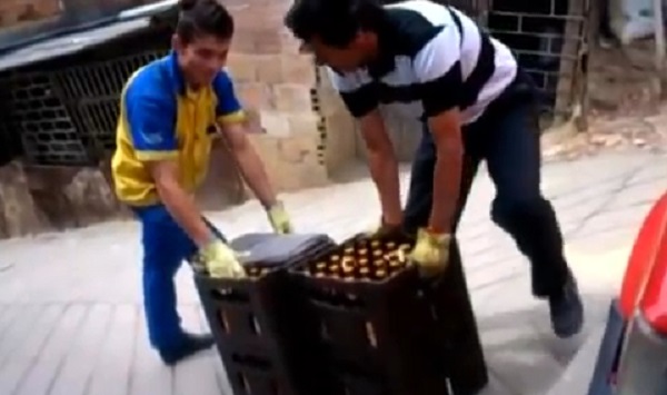 На спускане път в Богота, Колумбия, дистрибутори мисъл нова техника за прехвърляне на кутия бира.