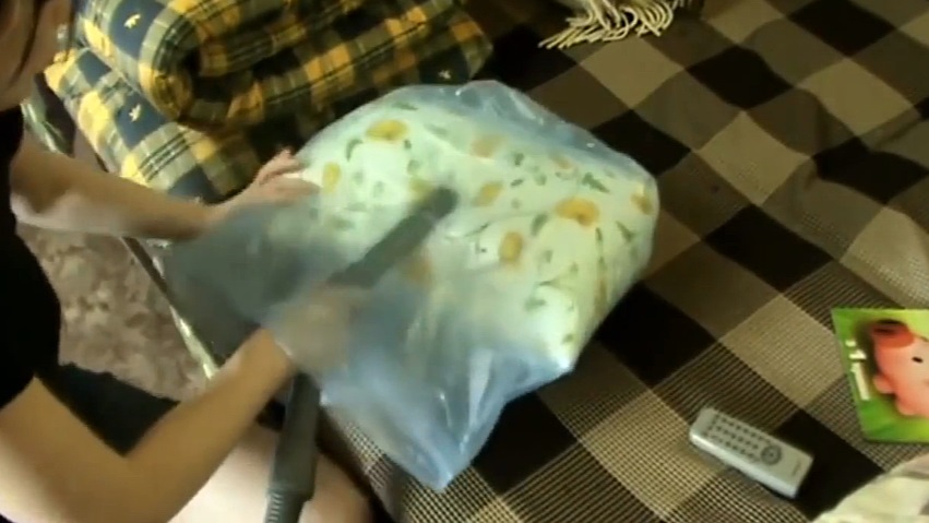 Как да се спести място в възглавнички за съхранение, с помощта на найлон чанта и прахосмукачка.