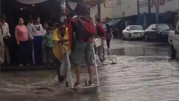 С помощта на количката, човек преминава през пешеходците на наводнена улица на Хуарес в Мексико Сити. С таксата за курса.