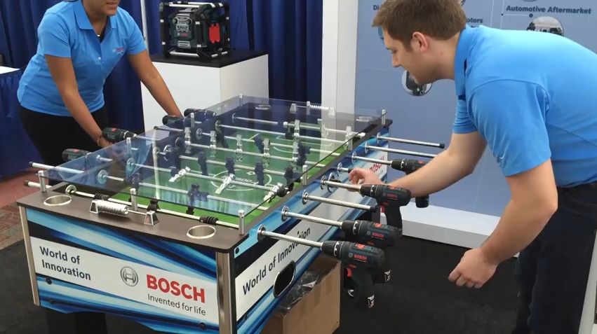 В лентата с инструменти на отчет, компанията Бош е създала дървена маса, която работи с помощта на електрически Отверки.