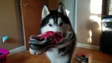 Катерица развеселен като играят с хъски, който гони около едно дърво.