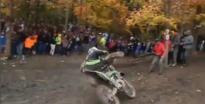 На мотоциклетното състезание GNCC 2014, един зрител избягва един мотоциклет, който идва в над извън контрол, Докато говори по телефона. Awesomely рефлекси!