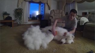 Един човек взима огромна хубава купчина бели косми след brushing сам, родословие Самоед куче. Brushing е продължило общо един час. Къде е плетене;