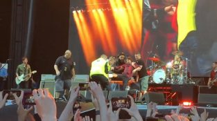 Дейв Грол разрушава крака си по време на концерта, но се връща...