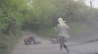След като се блъсна мотоциклетист, една жена идва веднага от колата си, забравяйки да дръпне ръчната спирачка. Сцената, която следва, е трагикомична.
