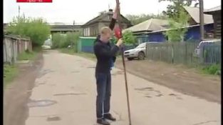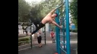 В един парк в Китай Хонконг, човек прави впечатляващ акробатични тъй като тя е уловена от хоризонтална лента, и създава впечатлението за ходене по въздух.