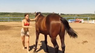 Един кон помага една жена е много трудно да се изкачи по гръб.