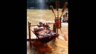 Двама мъже в Тайланд са създали импровизиран грил, което автоматично изключва месото с помощта на ток в реката.