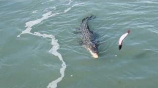 Възникна на 8 юни, 2017 г. / Принц Реджън река, Кимбърли, Западна Австралия „Изхвърлените остатъци от риба привлякоха интересите на няколко акули и голям соленоводен крокодил. The Croc доплува до лодката и зачака, [...]
