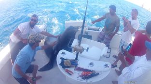 В Пончо, известен печат на рибарите Кабо Сан Лукас в Мексико, се издига на морски плавателен съд, за да се насладите на някои риби.