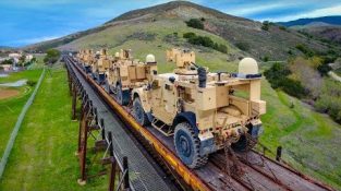 Едно непрекъснато заснемане на SMFKB военен влак, пътуващ в Сан Луис Обиспо на, Калифорния след учения в Кемп Робъртс на 20/03/18.