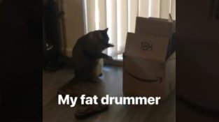 А котката удари краката й бързо върху картонена кутия, като свири на барабани.